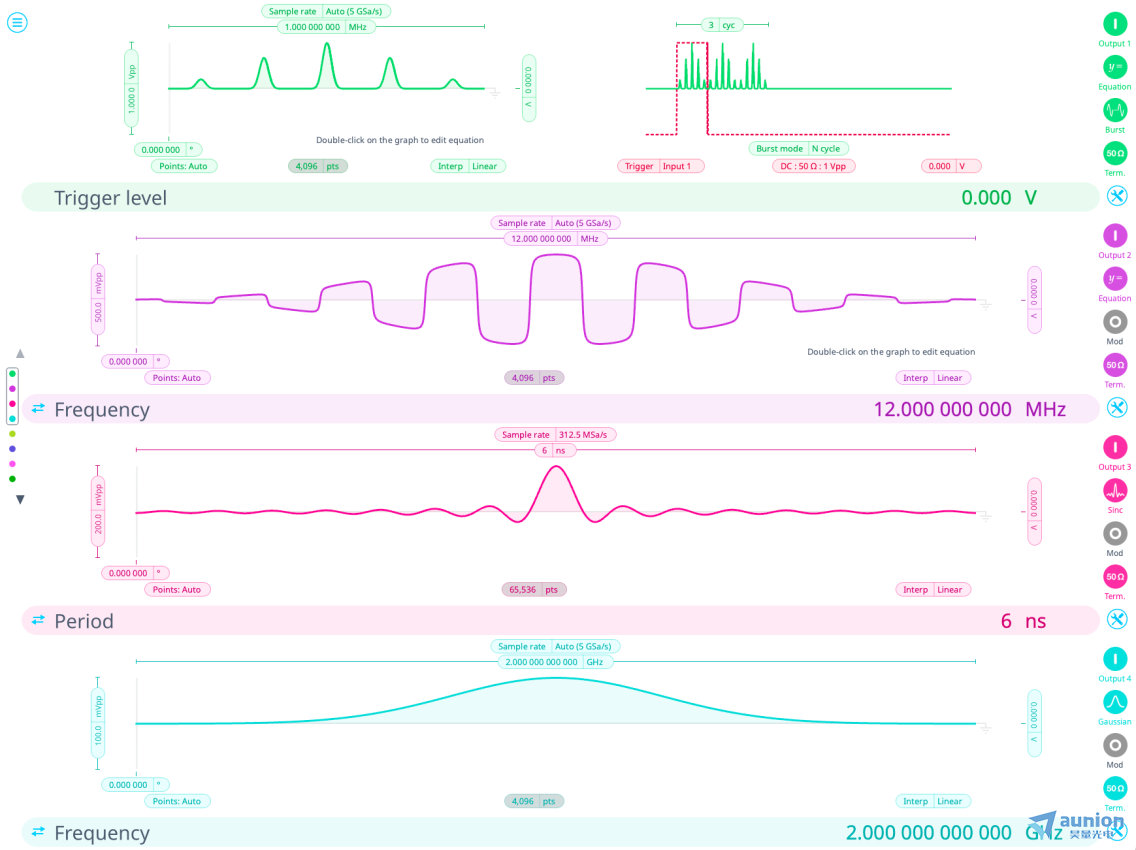 在实验应用中,其 突发模式(Burst Mode) 可由输入通道精准触发,支持单次输出或 N 周期循环输出,特别适用于激光脉冲序列、AOM/EOM 扫描、以及瞬态过程测量。