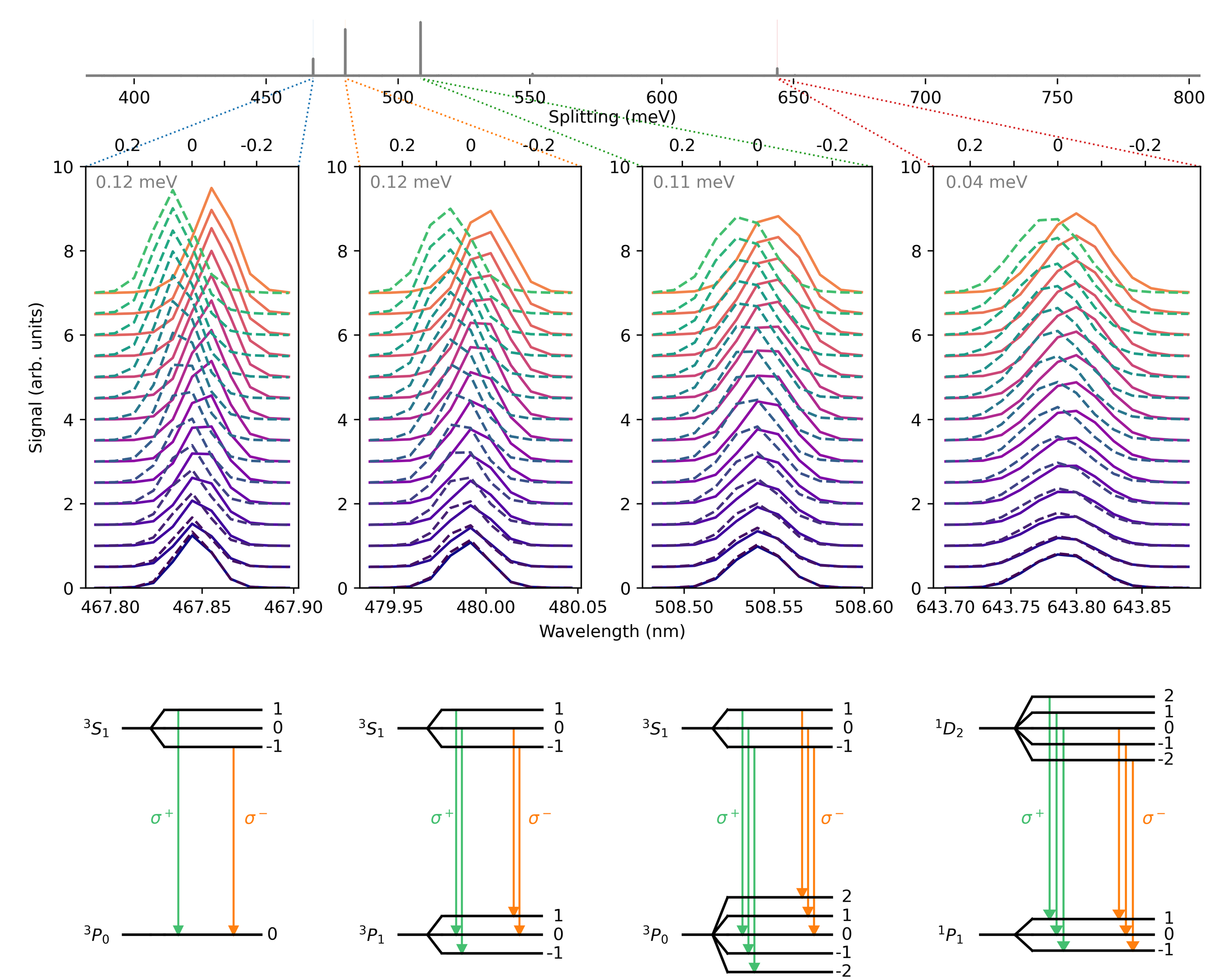 原子轨道可以用量子数Mj标记,表示总角动量。在蒸气灯中,激发态原子从高能级向低能级弛豫时会发射共振光,只有当自旋数Mj的变化为1或更小时,光学跃迁才被允许。Mj变化为-1的跃迁产生σ(-)圆偏振光,Mj变化为+1的跃迁产生σ(+)圆偏振光。在外部磁场中,自旋能级的塞曼分裂可以通过光谱测量,而利用偏振来独立分离σ(-)和σ(+)跃迁使测量更加简便。实验同时记录了镉的4种不同原子跃迁的塞曼分裂,显示出不同的自旋-轨道耦合。