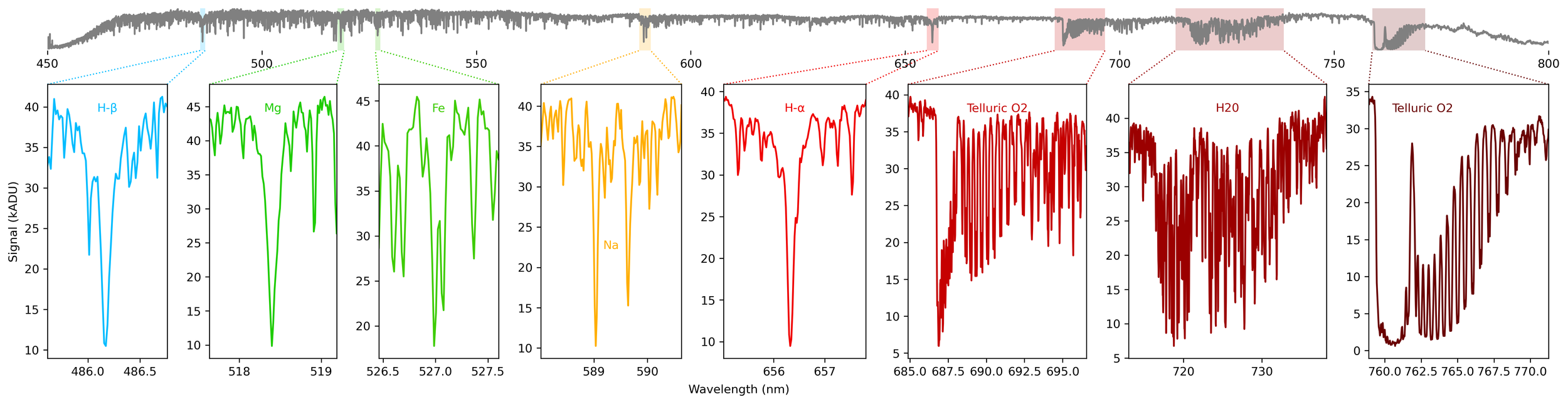 太阳光谱丰富而复杂,由连续光谱和众多吸收线组成。光纤对准太阳,用RS10k分析这些特征可提供有关太阳组成、温度和活动的宝贵信息,有助于我们理解太阳物理学和恒星物理学。下图展示了太阳光谱中350纳米宽的波段,标注了显著特征的区域(如钠双线D线和H-α线)。