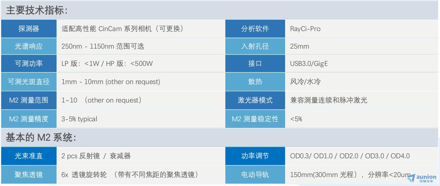 AUT-CI-M2 系列的全自动 M2 测量仪系统为昊量光电联合自研的 CINOGY INSIDE 系列光束测量系统方案之一,集成高性能的 CinCam 系列光束分析仪相 机,以及测量功能和算法非常强大的 RayCi-Pro 控制软件。可用于测量光斑尺 寸、束腰直径、2D/3D 能量分布、光束位置及稳定性、发散角、瑞利长度,BPP 及光束质量因子 M2 等。