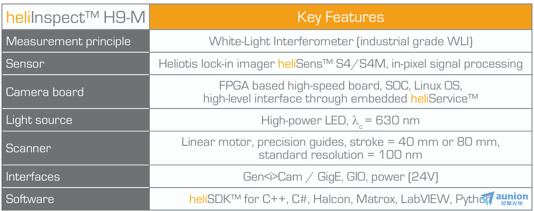 对于那些常规传感器已无法满足需求的应用场景,heliInspect™ H9 和 H9M 能凭借极高的亚微米级高度分辨率脱颖而出。这些属于行业标准级别的白光干涉仪之所以性能卓越,是因为它们采用了 Heliotis 的下一代 3D 像素传感器 heliSens™ S4 和 S4M。