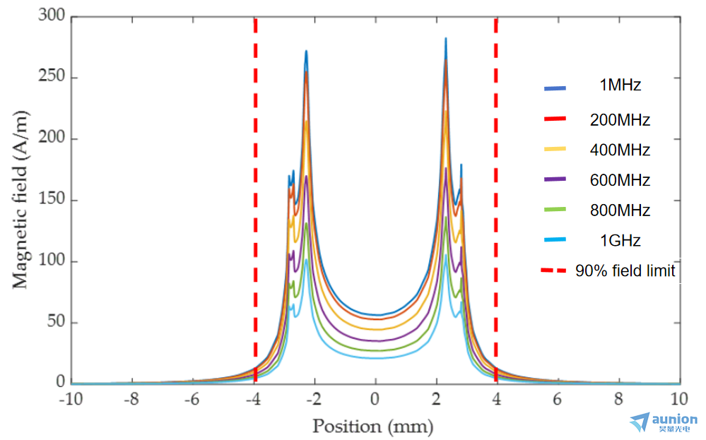 为了量化磁场的空间覆盖范围(探测区域),我们通过实验确定了包含90%磁场的半径作为评估标准。如图4虚线所示,该90%的磁场覆盖范围在特定剥离距离下保持恒定,当剥离距离分别为70 μm 和400 μm 时,对应的磁场覆盖范围分别为3.9毫米和4.5毫米。这些半径分别比线圈外部半径大39%和60% 。虽然探测区域与频率无关,但磁场强度会随着频率和剥离距离的增加而显著减弱。
