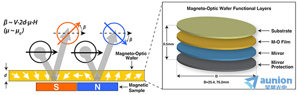 磁场可视化的基础是利用法拉第效应的磁光传感器技术。该传感器在传感器平面上产生一个二维的磁场图像。因为传感器平面被只有几微米厚的镜面覆盖,所以可以检测到靠近测试样本表面的杂散场。探测到的是测试试样的磁场相对于磁光传感器表面的法向分量。