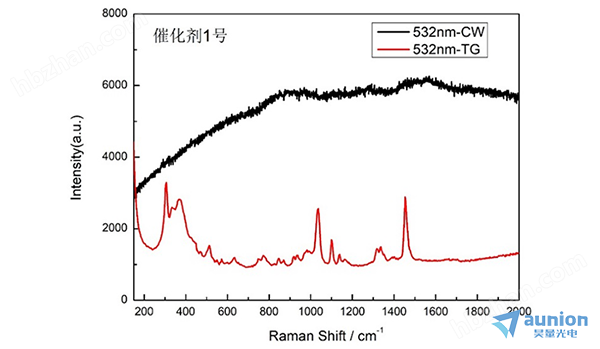以 1# 催化剂纳米材料为例,传统拉曼谱图被宽化荧光峰覆盖,关键结构信息完全丢失;