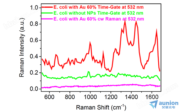 Timegate+SERS,Timegate,CW Raman检测大肠杆菌的拉曼谱图对比