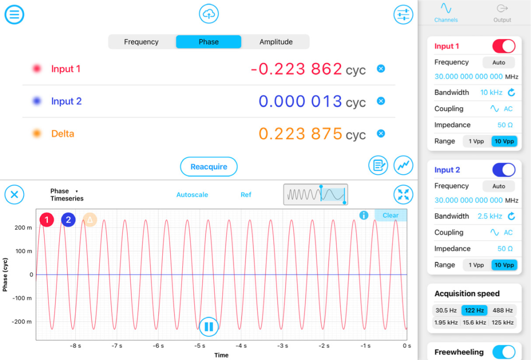 Moku:Lab基于全数字锁相环的相位表可同时对一个拍频信号的频率、相位、以及振幅进行连续的探测。通过锁相环的方式,相位表拥有远超于一个周期的相位探测范围。同时,相位表可以将锁相环中内置的数控振荡器的信号通过模拟输出输送给其他仪器,可驱动高速共振元件,或对某特定频率进行提取。