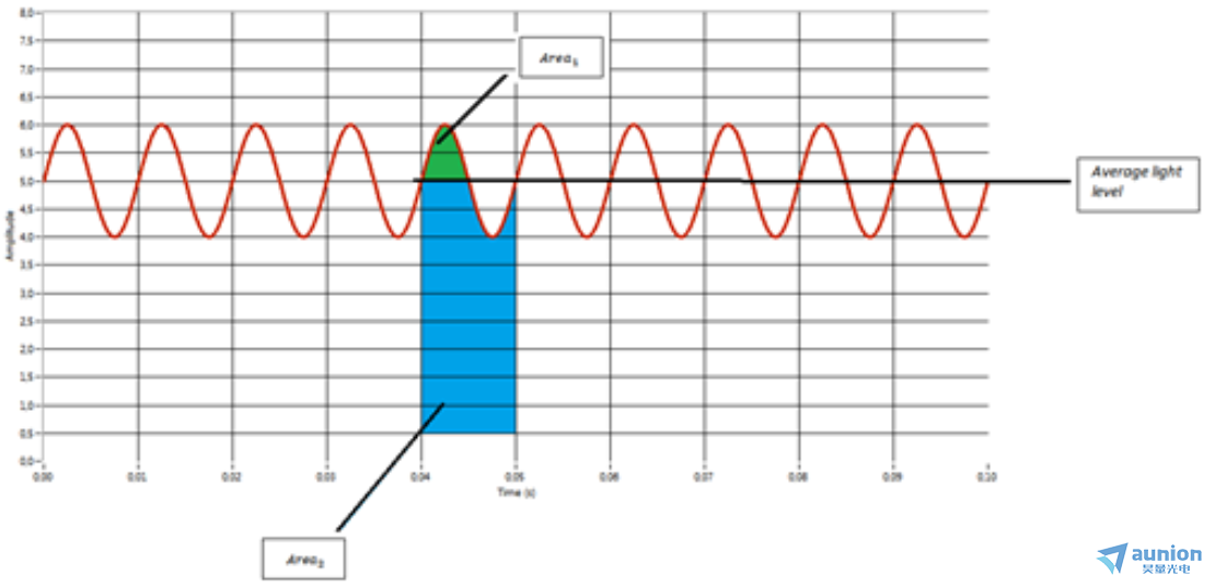 除了闪烁百分比,闪烁指数也非常重要。它表示曲线下面积与曲线上方面积的比率。中心线对应于平均光强度。在这里,值 0 对应于纯直流曲线,1 对应于纯交流曲线。该系数指定信号的占空比。