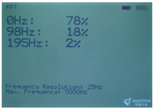除了计算闪烁参数外,BTS256-EF 还执行内部 FFT(快速傅里叶变换)。这使得检测信号中的其他频率分量成为可能。例如,100Hz 灯还可以包含 1 kHz 范围内的频率分量。在工作站上,多个光源可能重叠,这可能导致不同频率的叠加,从而其中一个信号相对于其他频率可能主导闪烁。然而,由于这些其他频率分量,研究闪烁效应及其权重可能很重要。由于设备中集成了 FFT 功能,因此可以在现场进行这种评估。zui多显示六个主要的频率分量。需要注意的是,由于噪声,FFT 中也可能存在分量非常低的高频信号,因此需要足够强的输入信号: