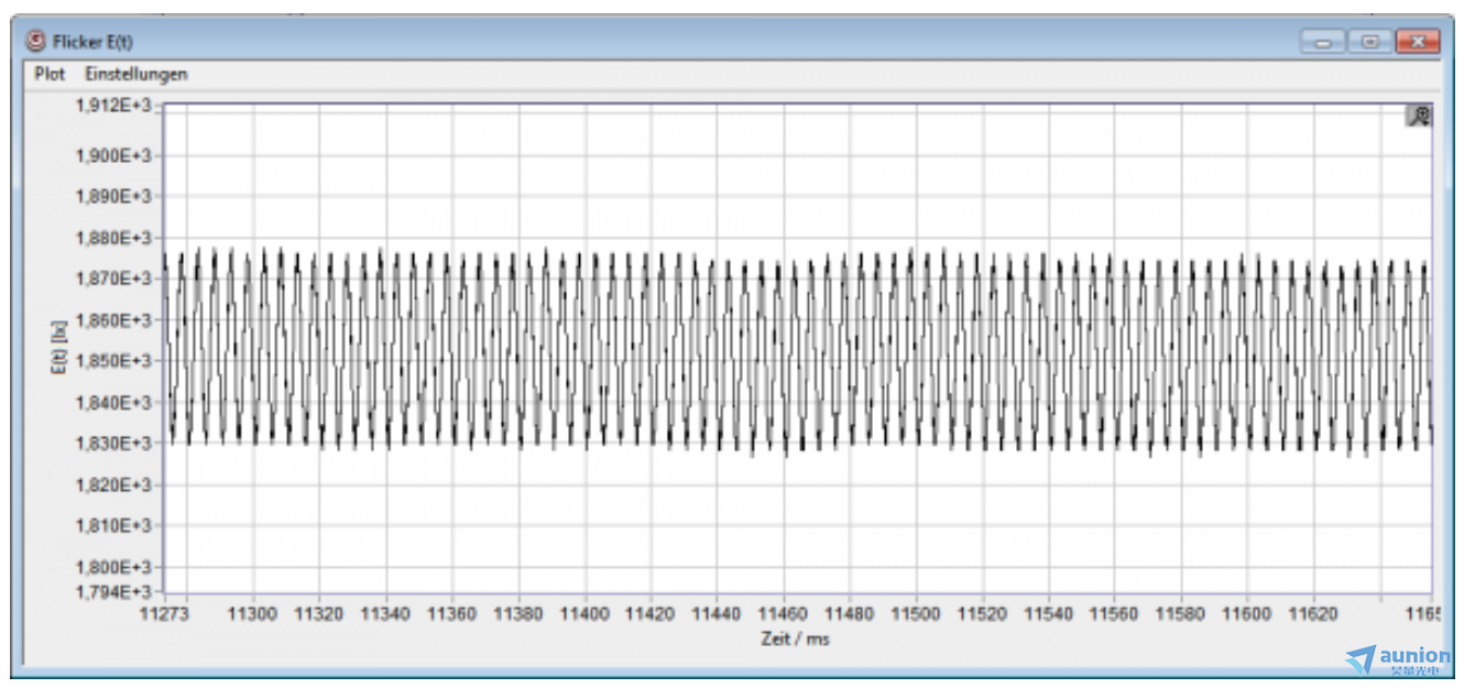 在测量精度方面应注意几点。基本上,要测量的信号应该足够强(例如,建议至少 100lx)。只有这样,才能保证闪烁测量的良好信噪比。图10显示了闪烁测量信噪比较差的信号示例。当将图 8 与图 7 进行比较时,差异变得明显。这会导致频率和闪烁参数的计算精度降低。这种影响的明显程度取决于闪烁信号的幅度,即使存在噪声,也可以检测到大幅度。然而,小的闪烁信号可能低于噪声水平,因此无法检测到。作为指导,噪声的幅度应明显小于闪烁信号的幅度。