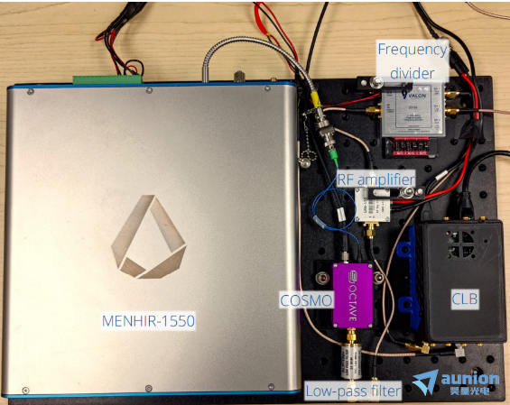 该稳定化装置完全集成在小型面包板上,并采用标准射频元件。MENHIR-1550梳状激光器可发射稳定脉冲,中心波长为1555纳米,重复频率达400MHz,平均功率超过80mW,脉冲持续时间为200fs。 由此产生的脉冲能量约为200pJ,可直接用于COSMO模块集成的f-2f干涉方案中,无需进一步放大即可检测激光的偏移频率(fCEO )。随后,通过CLB 电子设备实现的数字伺服回路可向激光泵浦二极管提供反馈, 以稳定fCEO 。该系统性能可与更复杂、更昂贵的装置相媲美。
