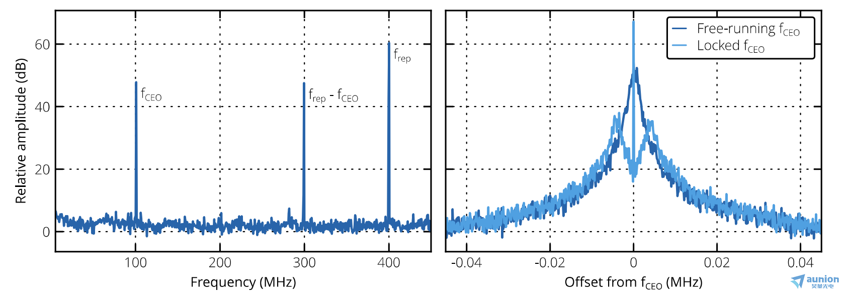 图3-(左)射频频谱,显示自由运行模式下 fCEO 跃动以及重复频率(frep )及其镜像信号(frep -fCEO )。