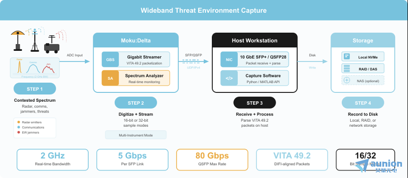 Moku:Delta的高速信号采集记录回放仪(Gigiabit streamer)为现代射频测试测量提供了一种全新的解决方案,单台设备实现信号采集-处理-回放-注入的闭环测试流程。信号数据通过标准以太网架构进行实时双向传输,采用基于 UDP/IPv4 的 VITA 49.2(DIFI)标准协议,可以低延时、确定性的传输速率在 Moku:Delta和标准合规主机之间进行实时采集、传输和回放。无需专用驱动,也不受厂商硬件封闭生态限制。在多仪器并行模式下,与 Moku 其他仪器协同并行,结合 API ,让“实验-分析-迭代”成为可复现的自动化脚本流程。
